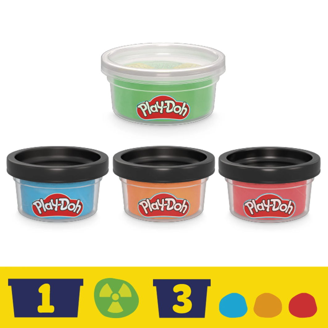 - 4 Cans of Play-Doh (Including Radioactive Green): This Play-Doh kit comes with three 1-ounce (28 g) cans of Play-Doh in red, blue, and orange, plus a 2-ounce (57 g) can of dual-colored Play-Doh in green with a yellow radioactive symbol! Contains wheat