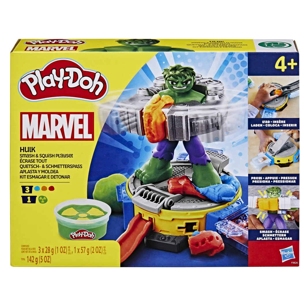 - HULK PLAYSET: Put the can of play in kids' hands with this Play-Doh Marvel toy set! Create Play-Doh trucks, tanks, and more and smash them with the HULK figure in his can suit.